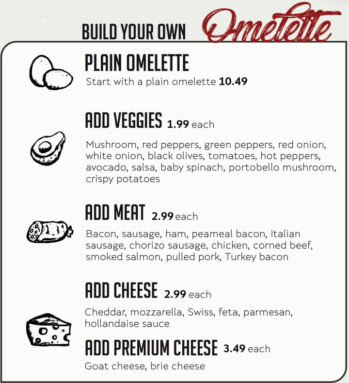 Three eggs any style with a choice of bacon, sausage, smoked ham, sautéed veggies or avocado