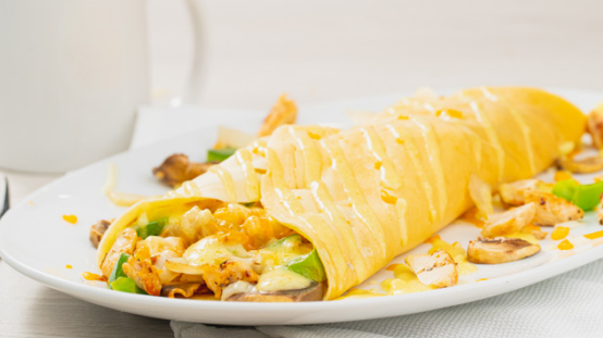 Crispy tortillas filled with bacon, ham, sausage, eggs, tex-mex cheese, sautéed peppers and onions. Topped with sour cream and served with homefries and mixed green salad